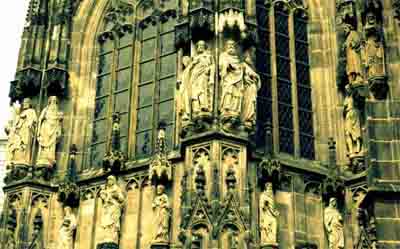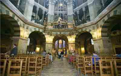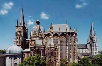 【亚琛大教堂】:这座教堂的核心是拜占庭风格的小八角礼堂,建于805年。2003年经过修缮,其马赛克和大理石闪闪发光,显得焕然一新。这座教堂是查理曼大帝下令修建的,从936年到1531年,有30位神圣罗马帝国的皇帝在此加冕。教堂中央的铜吊灯是巴巴罗萨国王在1165年赠与教堂的。查理曼大帝本人也安葬在圣坛后的金色神龛。
