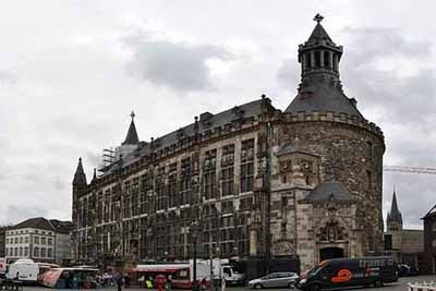 【亚琛市政厅】:亚琛哥特式市政厅及其二层楼上的加冕典礼大厅是亚琛市民14世纪在卡洛林皇宫的墙基上建造的。市政厅的墙壁上装饰有五幅绘卡尔大帝生平传奇帮事和历史事件的湿壁画,这些画作是亚琛艺术家阿尔弗雷德·雷特尔(1816——1859)于19世纪创作的。皇权象征的复制品(十字架金球、宝剑、王冠)以及一份来自卡洛林时代的手稿都值得一看。这些展品让人想起813至1531年间在亚琛举行的38次国王加冕典礼。自1949年起,每年在这里颁发亚琛城市国际卡尔奖,以表彰那些为欧洲相互理解做出过贡献的人士或机构。