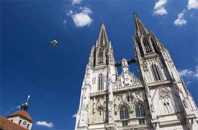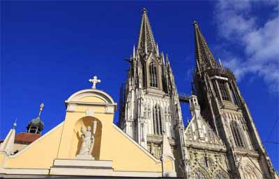 这座城市的宗教象徽和中心地标是雷根斯堡大教堂 (Regensburger Dom),即圣彼得大教堂 (Kathedrale St. Peter),现在的建筑为 1260-1520 年重建所成。 作为巴伐利亚哥特式建筑的杰出代表,这座教堂在过去数个世纪中对人们的生活产生了不可磨灭的影响。 漫步于大教堂回廊,除了众多珍品外,五座哥特式圣坛尤为引人注目——它们是大教堂的一大特色,而可追溯至 1220-1370 年的彩绘玻璃窗也令人印象深刻。 此外,大教堂还是雷根斯堡圣堂之雀少儿合唱团 (Regensburger Domspatzen) 的家园,他们在这里为礼拜仪式吟唱。该合唱团号称男童唱诗班中的“斯特拉迪瓦里”(Stradivari)。