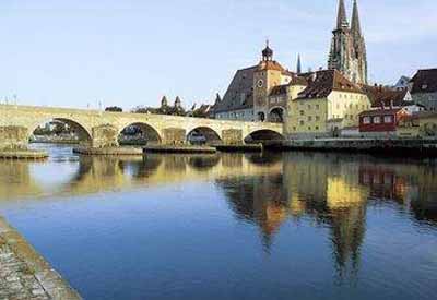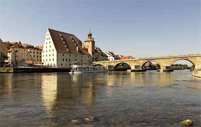 【石桥】:多瑙河上的这座石桥,外观朴素,但却有显赫的历史。始建于1135 年,于1146年完工的石桥,已经经受了将近900年的风雨洗礼,在很长一段时间内,是横跨多瑙河的唯一桥梁,为雷根斯堡在中世纪 的发展,起到了决定性的作用。它的坚固、实用和优雅低调的外观, 也成为了许多石桥的典范。在桥的中间有一尊雕像Bruckmandl,一个年轻的男人望着老城,象征雷根斯堡自由市从主教统治下获得独立。