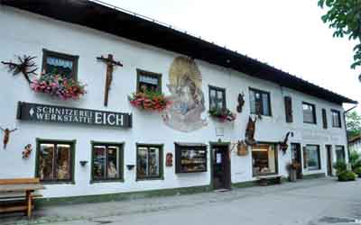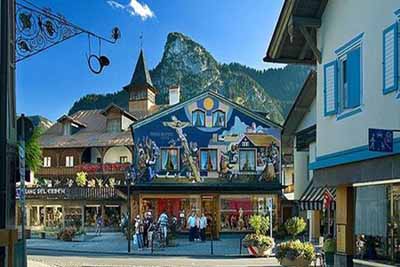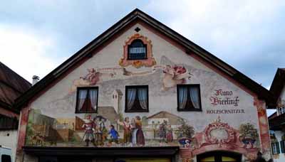 上阿默高(Oberammergau),著名的壁画小镇,坐落在德国南部阿尔卑斯山脚下。镇子不大,约有一百几十户人家,几乎每家房屋外墙上都绘有各式各样题材的壁画,大多数是宗教,还有人物、动物、童话故事、花边装饰等,代表着每家的信仰、爱好、文化、职业等不同含义。小的一壁画约有一两个平方米,大的差不多占据了整面墙壁。