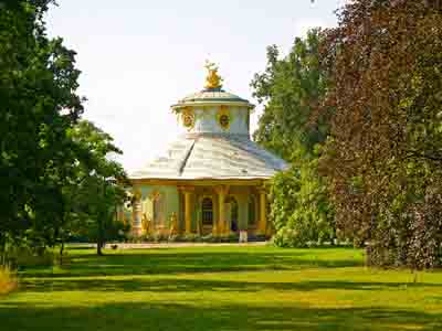 参观建于18世纪,当时中国及东方艺术风格非常流行,亭子四周镶嵌的是想象中的东方风格的镏金雕像。