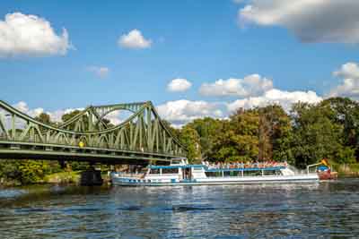 格林尼克铁桥坐落在柏林西部与波茨坦交界的哈弗尔湖上,桥的因近处的格林尼克宫得名。在冷战时期,这里是西柏林和东德的界桥,美苏双方利用此桥来交换被对方逮捕的特工和间谍。在桥的波茨坦一侧,有一面标出冷战时期边界的牌子。对历史感兴趣的游客可从柏林一侧徒步走到波茨坦一侧,两分钟的时间中从跨越几十年的历史时光,也是一种奇特的体验。